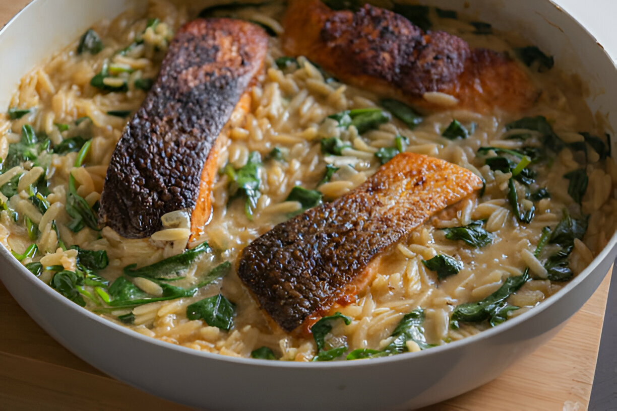 This Parmesan Orzo and Salmon dish delivers a perfect blend of rich, creamy textures and aromatic flavors. With crispy, herb-seasoned salmon resting atop velvety, Parmesan-infused orzo, itโ€™s a satisfying meal that feels gourmet yet comes together effortlessly.